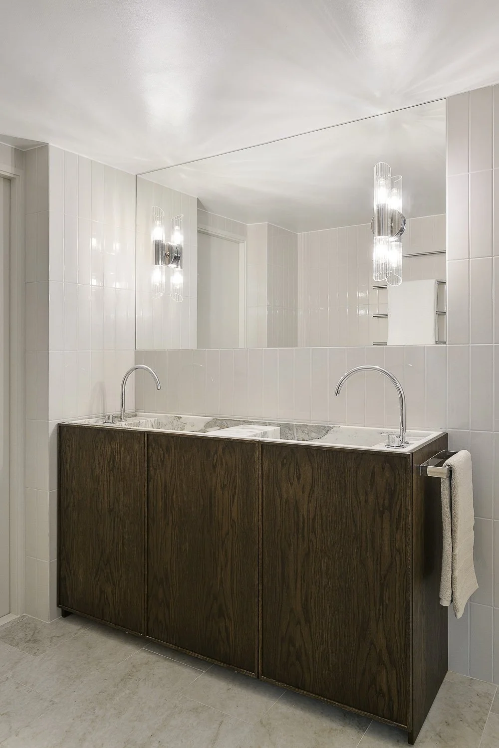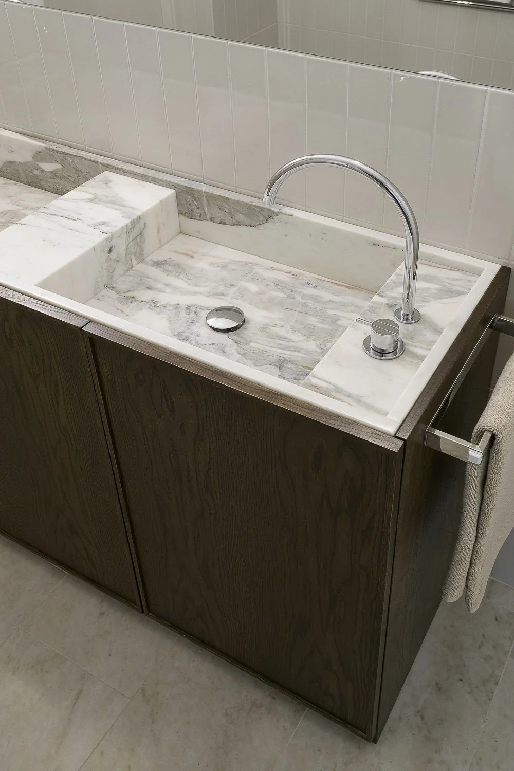 Ett specialanpassat underskåp i massiv, mörkbetsad ek till ett modernt badrum. Vår lösning blev ett underskåp med marmorskiva och skräddarsydda lådor – en harmonisk kombination av tidlösa material och modern design.