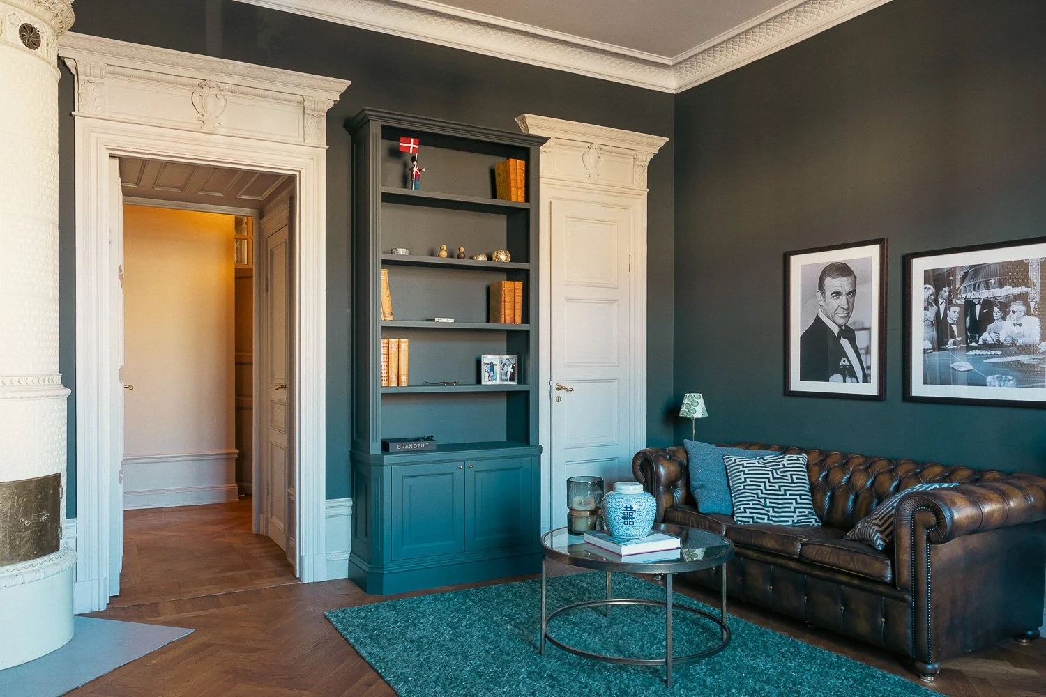 Som en del av helheten installerades dekorativa originaltaklister i gips, vilka samspelar med rummets övriga detaljer och förstärker dess klassiska karaktär. Belysningen består av kromade vägglampetter med textilskärm, vilket ger ett mjukt och elegant ljus.