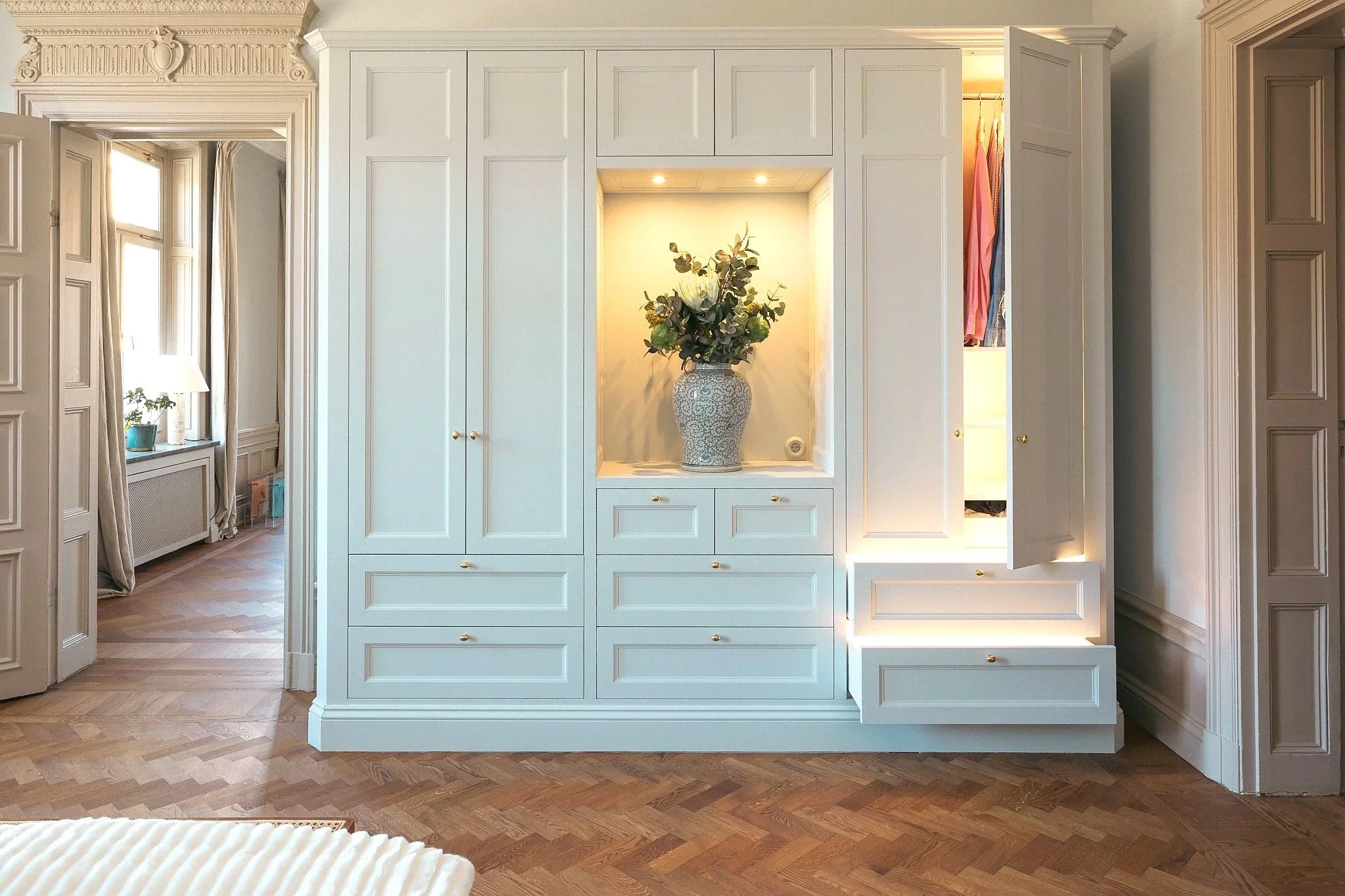 Detta projekt beställdes av en återkommande, nöjd kund som ett kvitto på både förtroende och kvalitet. Den platsbyggda garderoben är utformad med precision; skåp, hyllor och lådor har anpassats för att harmoniera med rummets arkitektur. Ett särskilt iögonfallande inslag är den integrerade LED-belysningen, diskret placerad i de övre nischerna, inuti garderoben och i lådorna. Samtliga dörrar och fronter är tillverkade av 22 mm massivt björkträ i klassisk spegeldörrsstil.