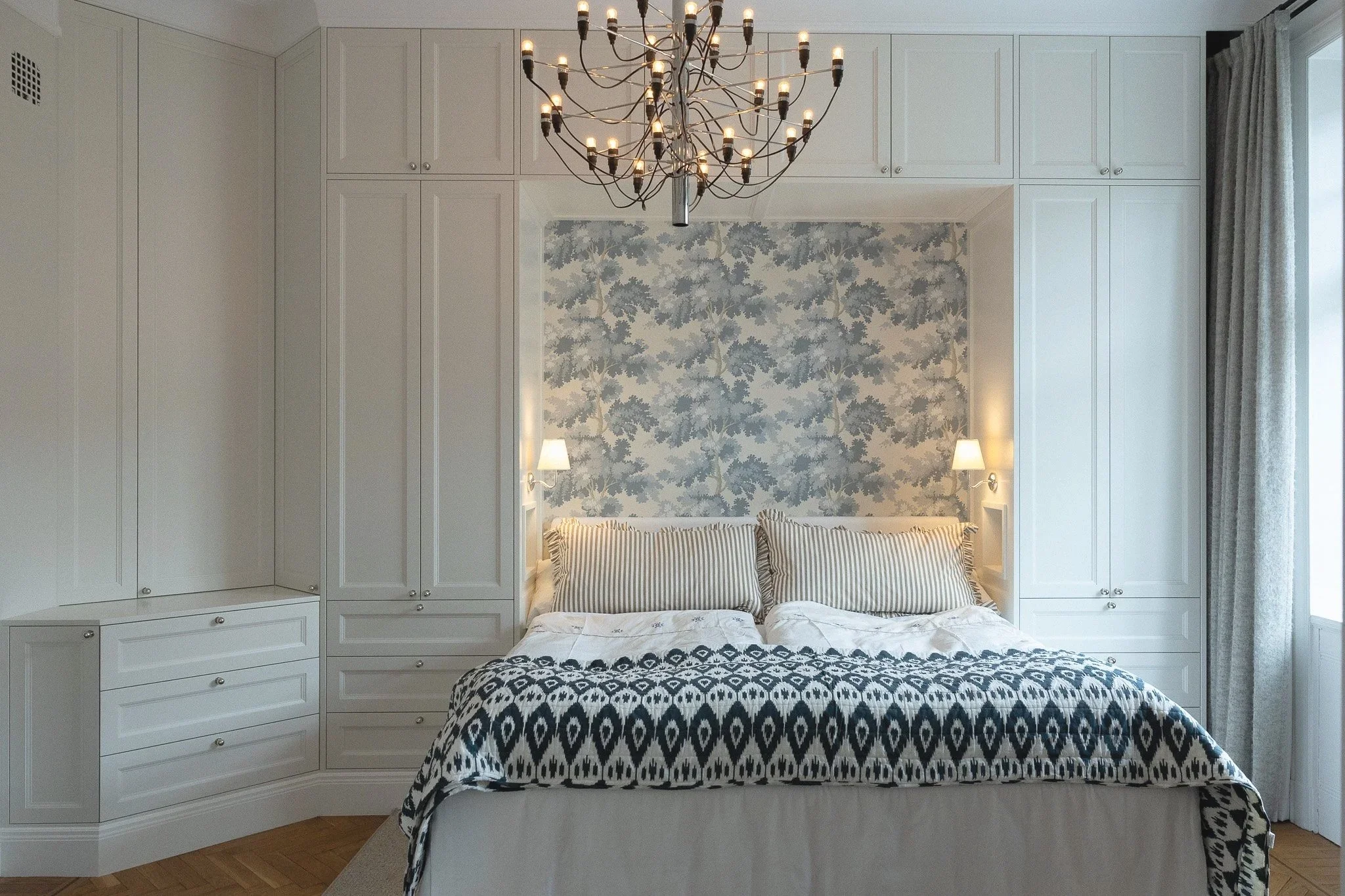 Vi designade och byggde integrerade garderober runt sängen, med klassiska skåpluckor som sträcker sig hela vägen upp till taket. Utöver klädförvaringen skapades en nisch med eluttag för mobiltelefonladdning som en diskret och funktionell lösning vid sängen. Samtliga dörrar och fronter är tillverkade av 22 mm mdf.
